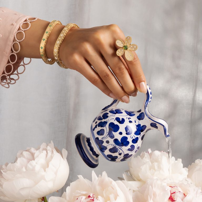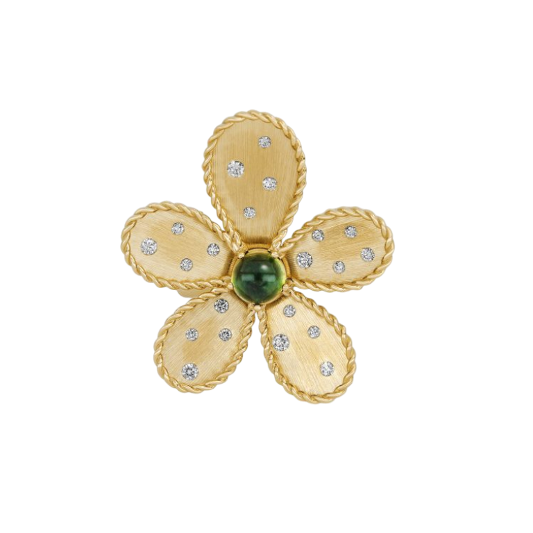 • Presenta oro amarillo de 18 quilates, diamantes y la magnificencia de una joya hecha a mano.
