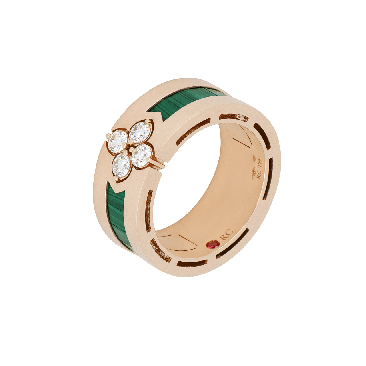 • La malaquita colorea este anillo floral con diamantes, oro rosa de 18 quilates y la singularidad de una joya hecha a mano.