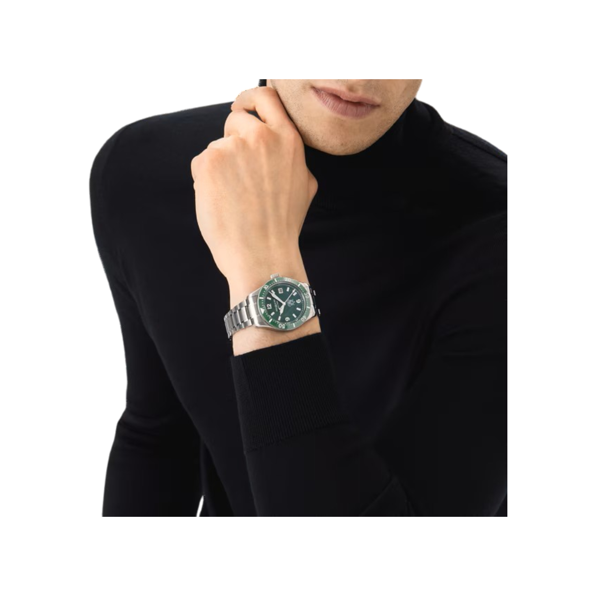 • Esfera con patrón glaciar verde con números arábigos e índices rodiados luminiscentes blancos.