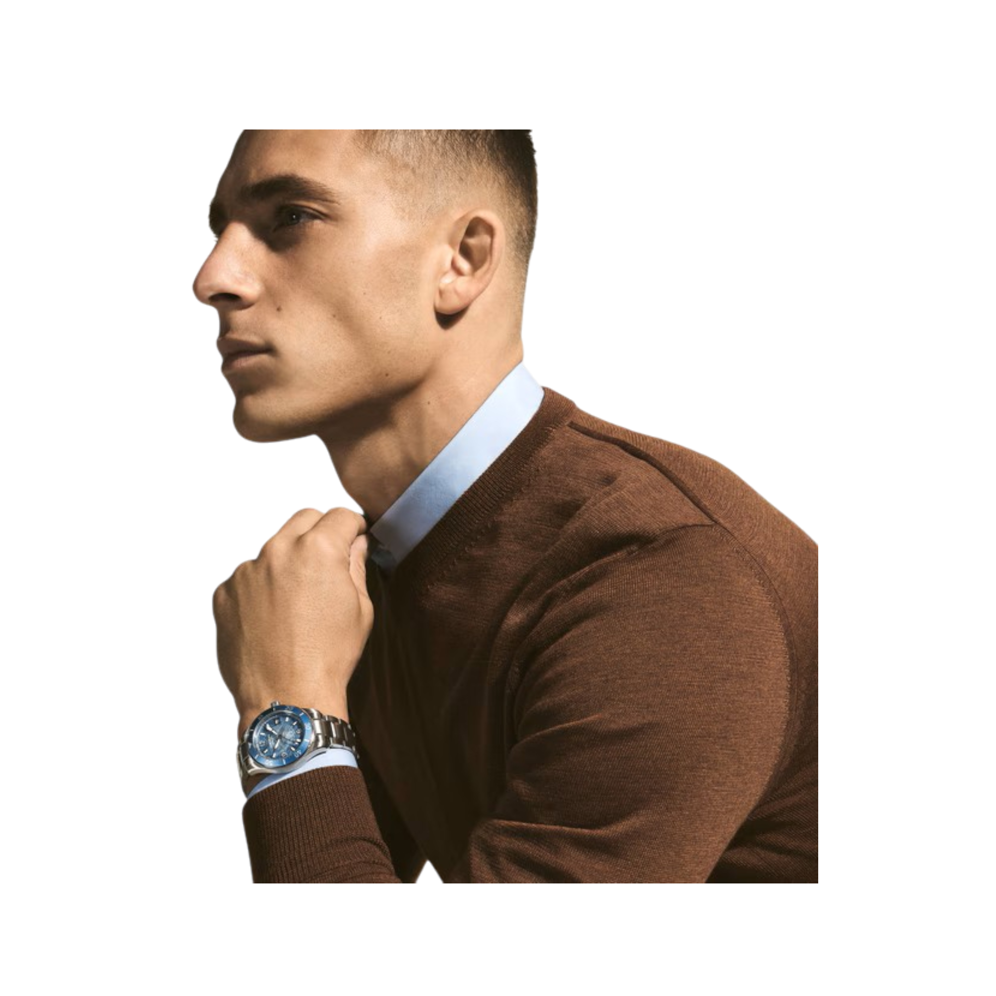 - Esfera con patrón glaciar sfumato azul con números arábigos e índices rodiados luminiscentes blancos.