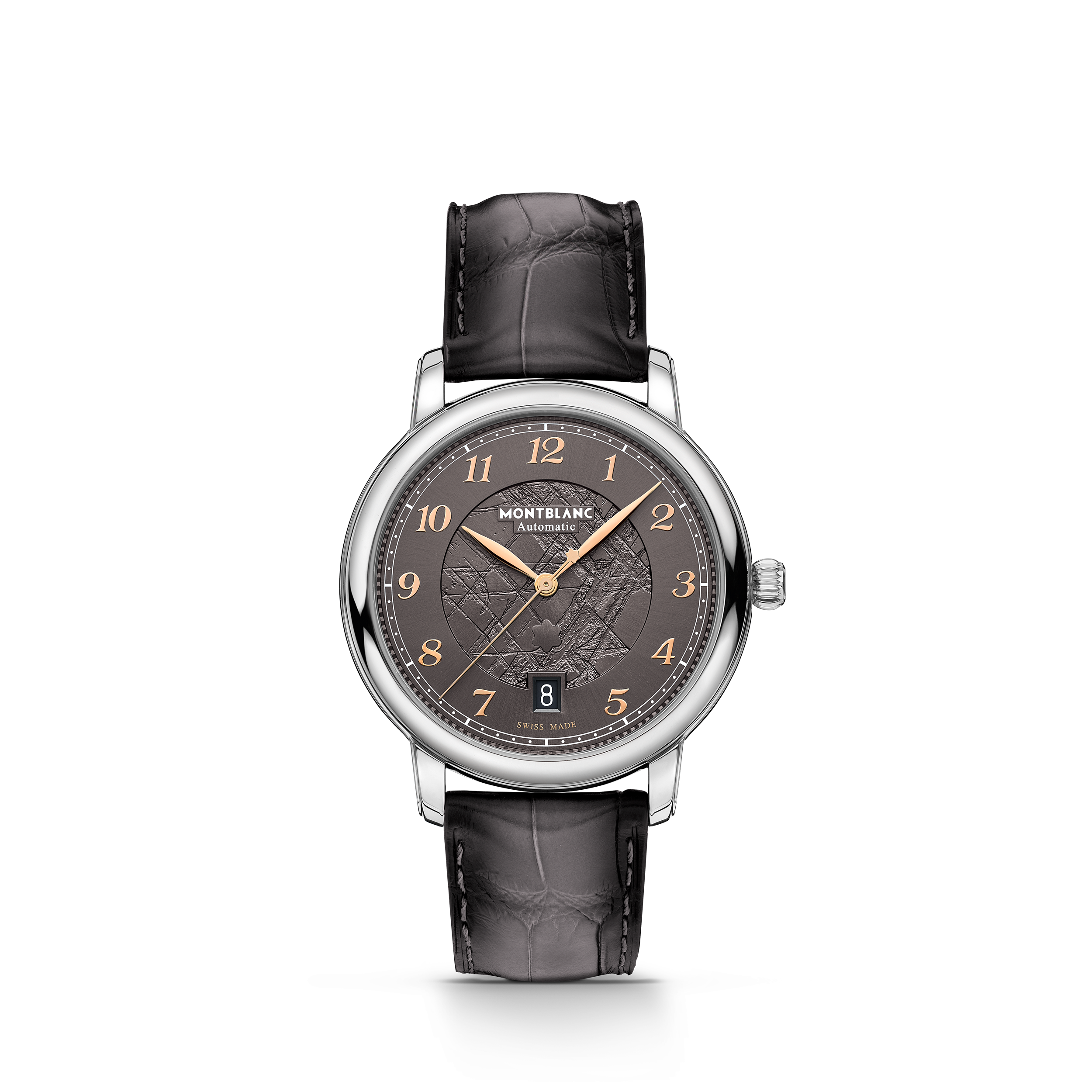 • Presenta en una caja de acero de 39 mm que realza una nueva faceta del Mont Blanc: su cara rocosa orientada al sur, ya que la nieve no se asienta bien en su cara vertical. La esfera gris con motivo de glaciar de este reloj está realzada con agujas y números árabes chapados de oro rosa. Otro bonito detalle reside en el emblema Montblanc, que se cruza cada minuto tanto en el segundero como en la esfera, justo al lado de la fecha.