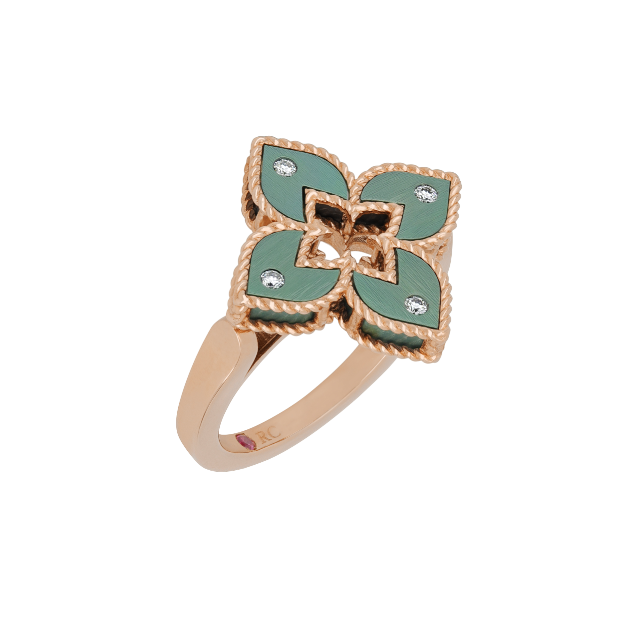 Un tono verde de titanio le da singularidad a este lindo anillo, con oro rosa de 18 quilates, diamantes y la magnificencia de una joya hecha a mano.