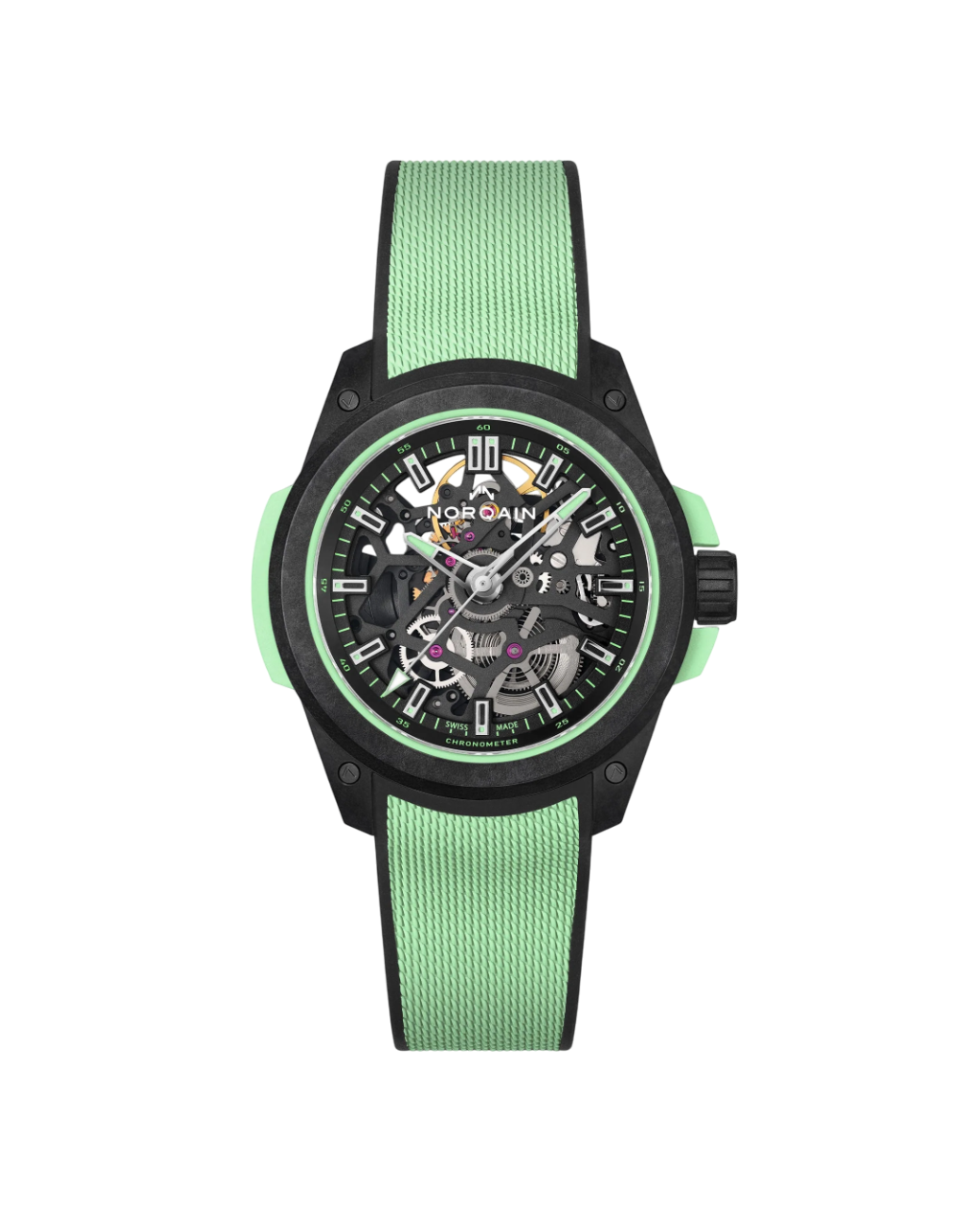 - Agujas de horas y minutos facetadas con corte de diamante, chapadas en rodio, punta verde menta rellena de Super-LumiNova® X1